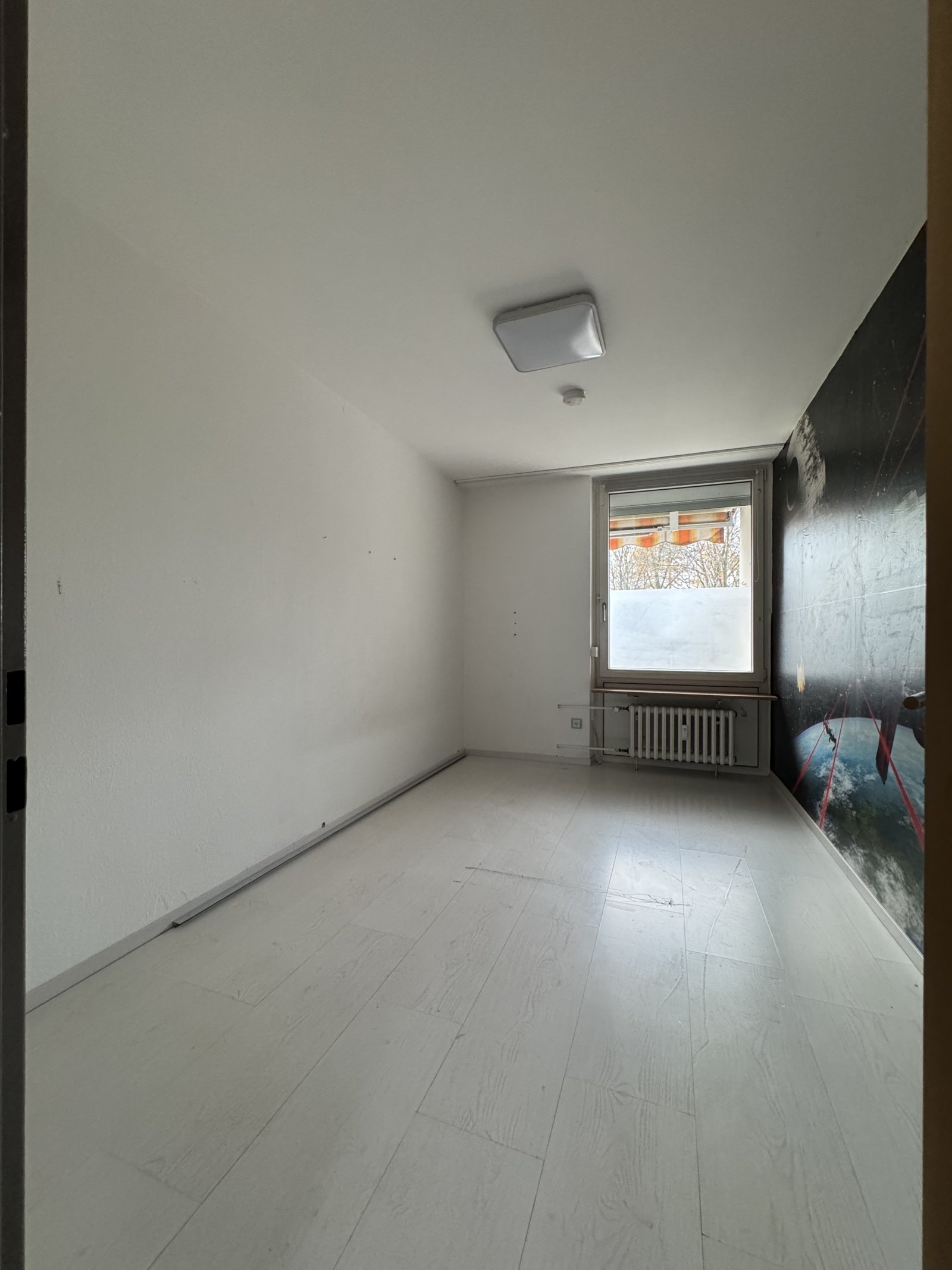Am Ende des Flurs öffnet sich der Weg in den zentralen Wohn- und Essbereich, der das Herzstück der Wohnung bildet. Von hier aus gelangen Sie in alle weiteren Räume: geradeaus ins Schlafzimmer, links in die Küche, rechts ins Kinder- oder Arbeitszimmer sowie links daneben in das großzügige Wohnzimmer.