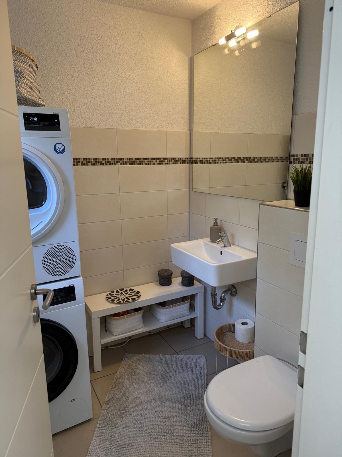 Auf dieser Ebene befindet sich außerdem ein geräumiges Badezimmer, ausgestattet mit einer Dusche sowie einer zusätzlichen Badewanne – ideal für Familien oder alle, die besonderen Komfort schätzen. Zusätzlich gibt es noch eine Abstellkammer, die zusätzlichen Stauraum bietet.