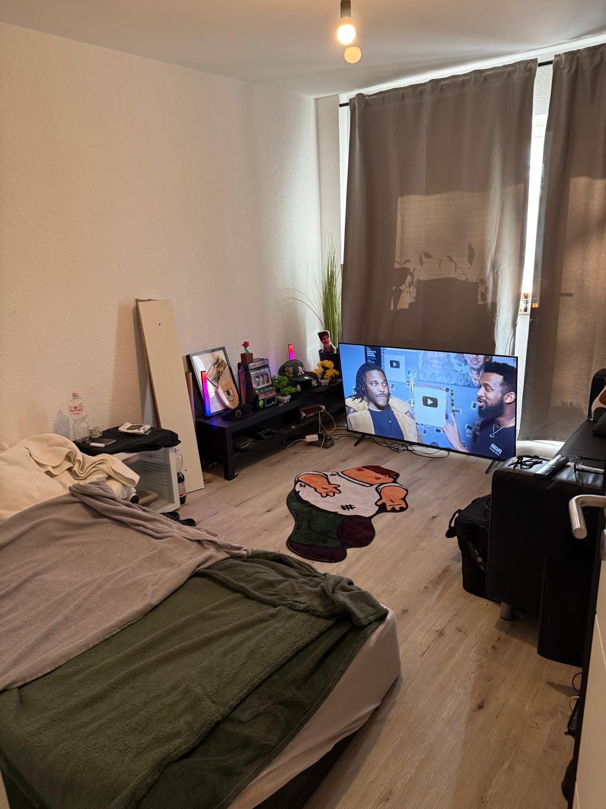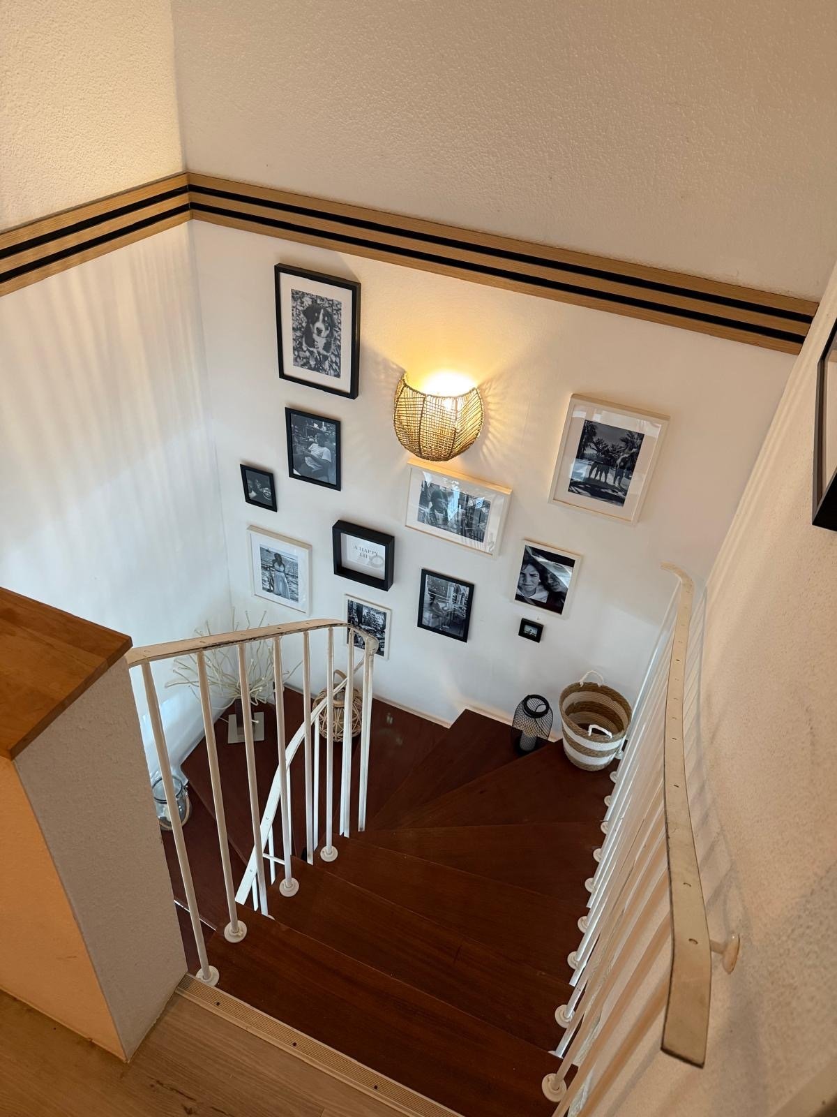 Über die Treppe zwischen Wohnbereich und Flur erreichen Sie die obere Etage der Wohnung. Hier befinden sich insgesamt drei gut geschnittene Zimmer: ein großzügiges Schlafzimmer, ein Kinderzimmer sowie ein weiteres Zimmer, das flexibel als Gäste- oder Arbeitszimmer genutzt werden kann.